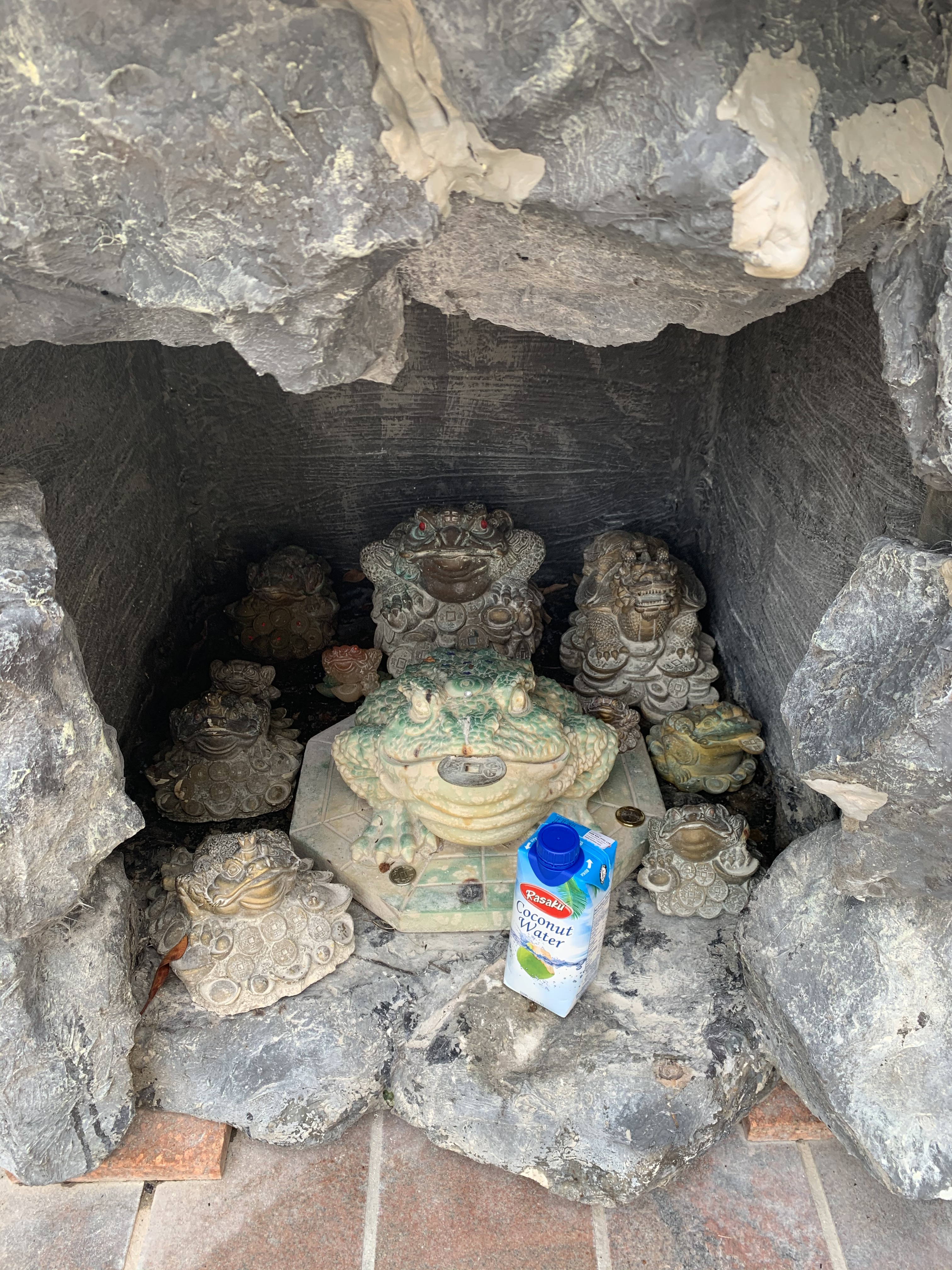 Am schlafenden Buddha (offensichtlich schlafen Buddhas mit Augen auf!) ging es weiter auf den Hof des Tempels. Er ist eigentlich im Eingangsbereich, aber aufgrund von Covid ist er abgesperrt und nur über den Tempel selber zu erreichen. Im Hof stehen mehrere Schreine. In einem sitzen steinerne Frösche mit Münzen im Maul. Sie sollen dafür sorgen, dass das Geld nie ausgeht. Wer oder was die Figur auf dem mittleren Bild ist, weiß ich nicht und konnte ich auch nicht rausfinden. Besonders sehenswert fand ich aber die Figuren im dritten Schrein. Ein älteres Ehepaar sitzt da in für Thailand typischer Kleidung und davor, wie eigentlich überall im Tempel, brennende Räucherstäbchen.