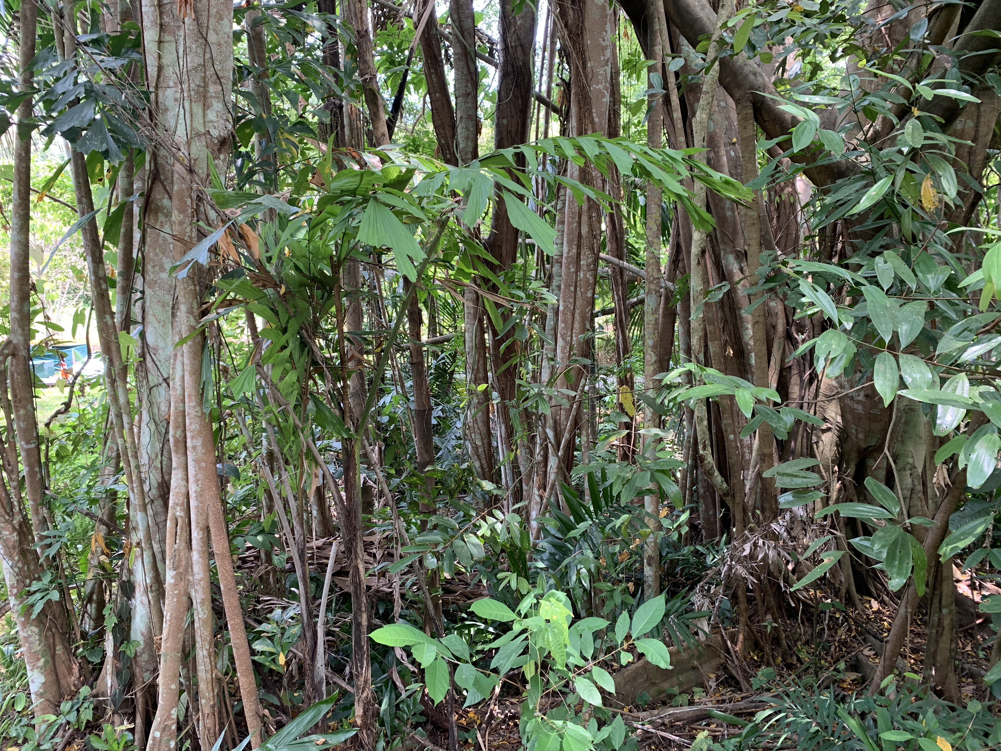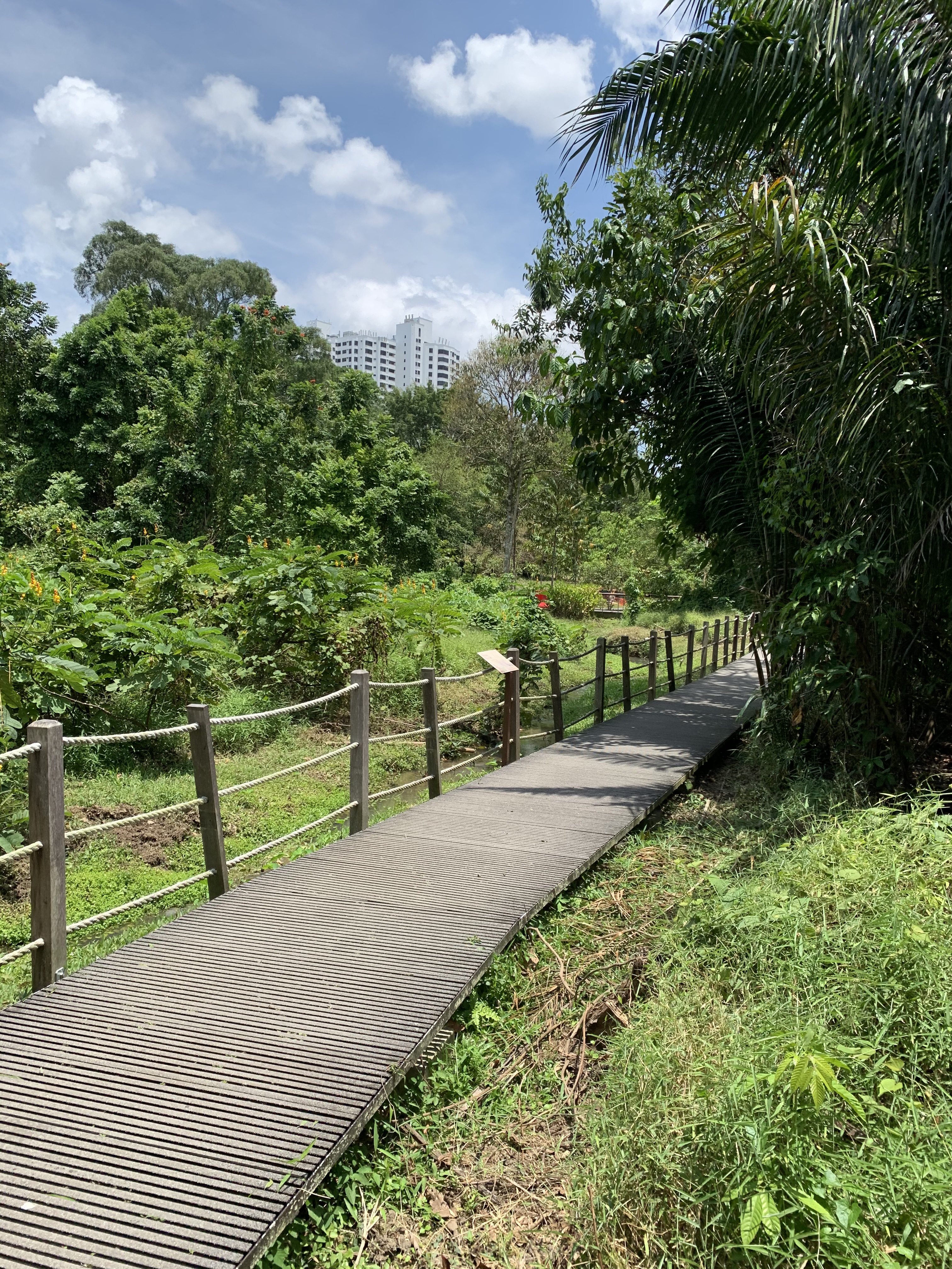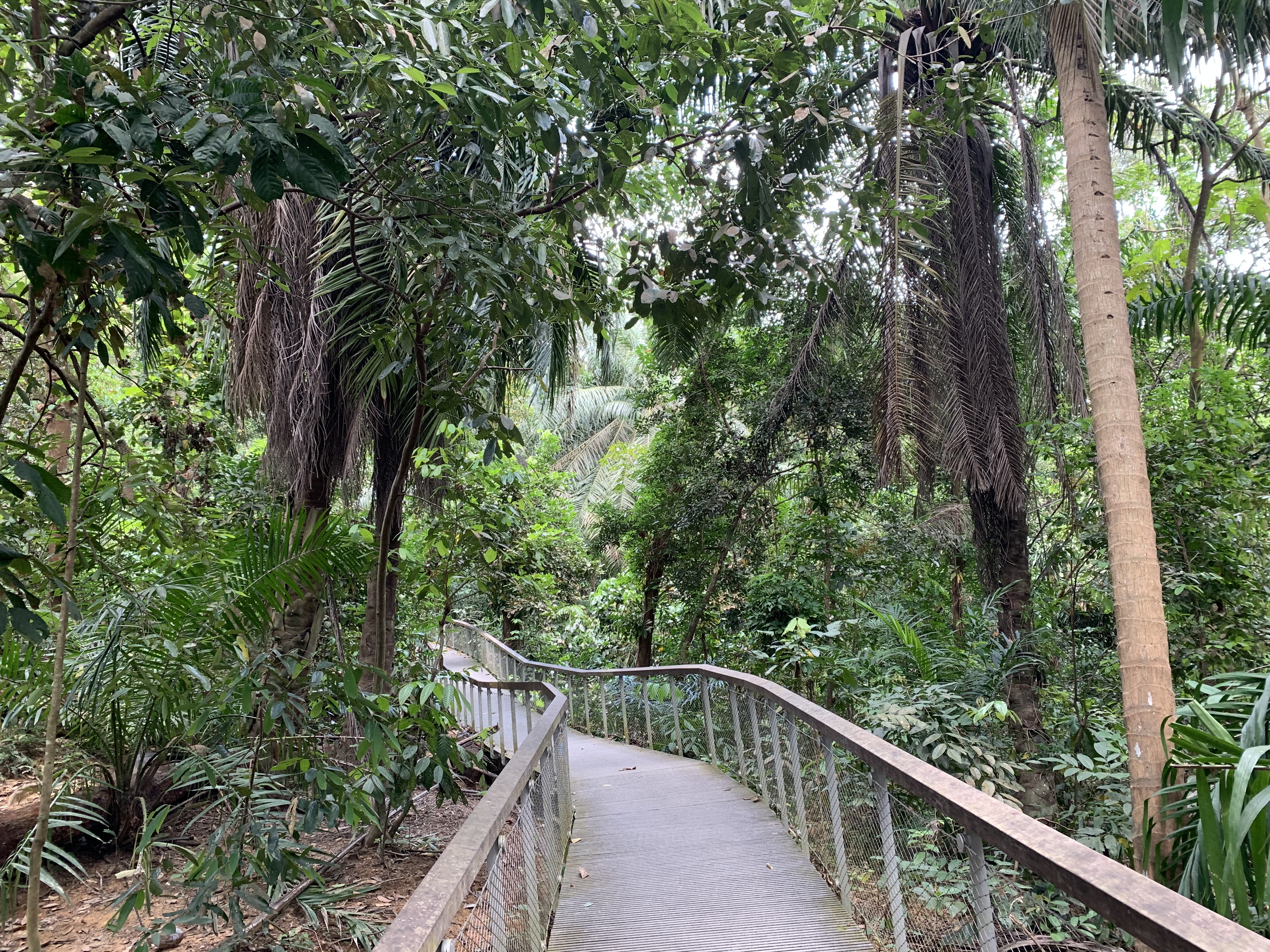 Mein Mann hatte vor ein paar Tagen Geburtstag. Uneigennützig hatte ich ihm ein Buch über die Natur in Singapur geschenkt. Darin war das Central Catchment Nature Reserve als besonders schön beschrieben. Was ich nicht gelesen hatte, aber jetzt dann nach unserer langen Wanderung und zahlreiche Landkarten später verstanden, ist, dass das Central Catchment sich aus vielen Parks zusammen setzt. Einer der neueren Parks ist der Windsor Park mit seinen zahlreichen für Singapur typischen Pflanzen. Da der Boden sehr sumpfig ist, läuft man über Stege zwischen den Bäumen durch. Super schön angelegt. Immer mal wieder zwischen den Bäumen, etwas, das aussah wie zusammengefallene Gebäude. Bunker? Keine Ahnung, aber hier muss es Anfang des vergangenen Jahrhunderts viel Militär gegeben haben. Ich habe mich noch nicht wirklich in die Geschichte eingelesen. Warum? Das ist eine andere Geschichte (-;