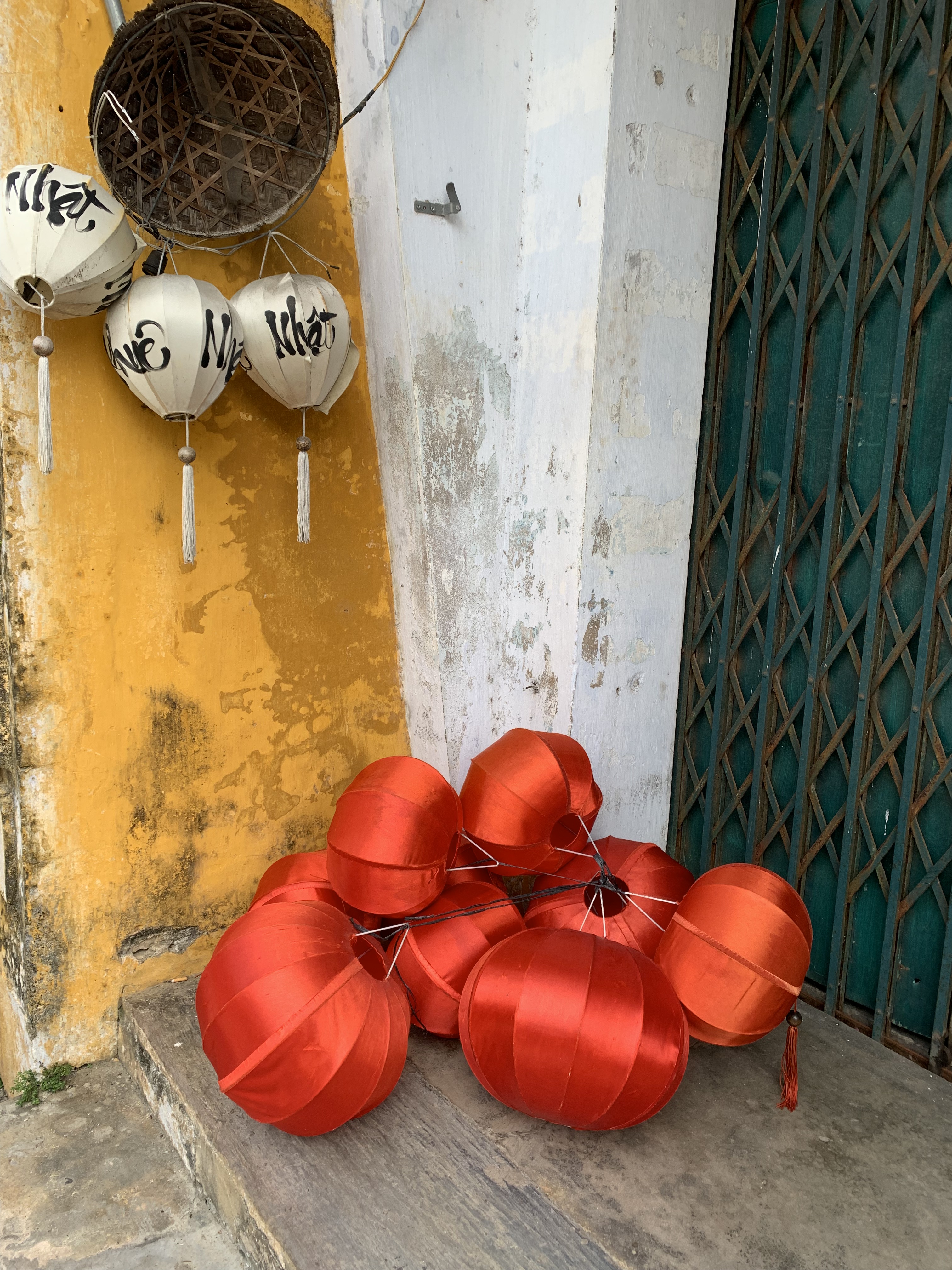 Gestärkt und nach so viel Koffein definitiv wach, sind wir zu Fuß durch die Altstadt von Hoi An. Überall hängen bunte Lampions oder zumindest deren Gerippe. An einigen finden sich noch Stofffetzen, die erkennen lassen, wie es ausgesehen haben muss. Leider hat Covid auch hier seine Spuren hinterlassen. Nicht alles ist super gut in Schuss. Viele Läden und Restaurants sind geschlossen. Aber dennoch ist nachvollziehbar, warum die UNESCO 1999 rund 800 (und damit fast die gesamte Altstadt) der für Hoi An typischen 2-stöckigen gelben Gebäude in den Gassen der Altstadt zum Weltkulturerbes gemacht hat.